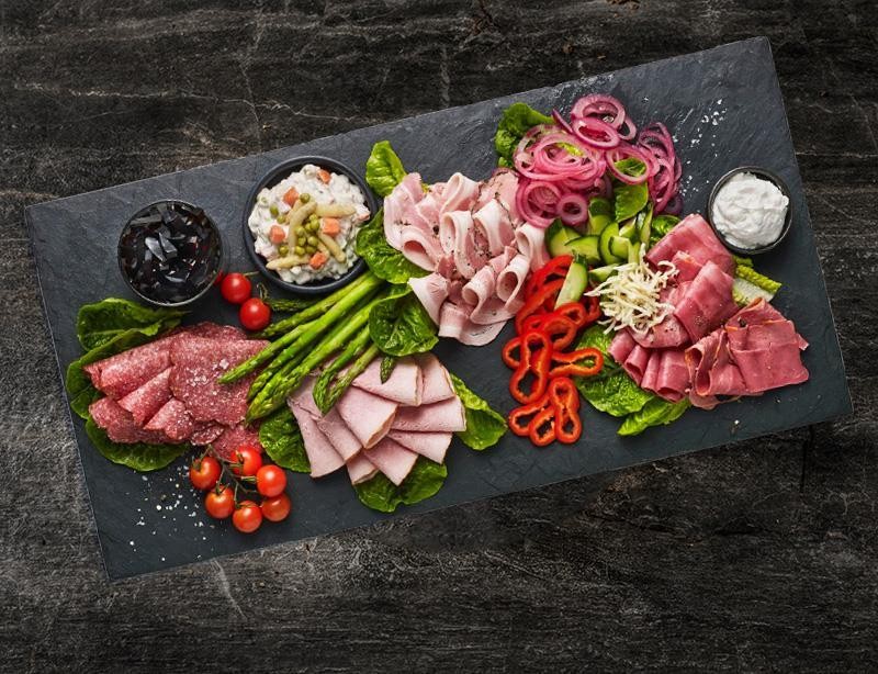 Indhold: 2 slags spegepølse 2 slags pølser Rullepølse Hamburgerryg Paté med surt Skinke med dilddressing og asparges